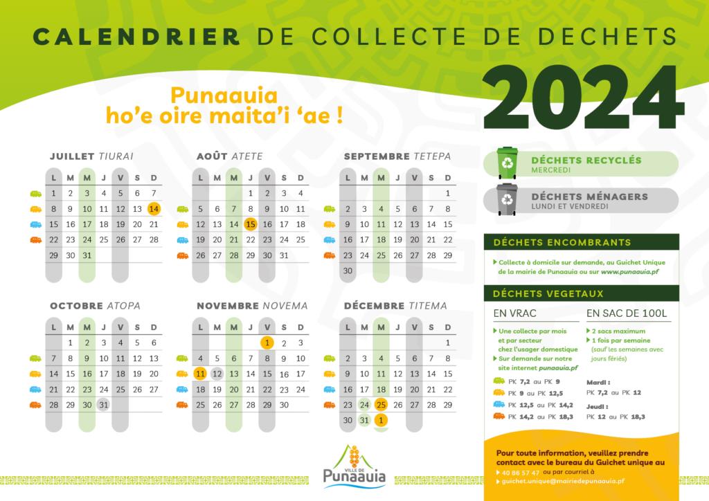 Vous venez dâemmĂ©nager Ă Punaauia et vous souhaitez bĂ©nĂ©ficier de la collecte des dĂ©chets ? Vous devez venir au Guichet Unique de la mairie de Punaauia, situĂ© au rez-de-chaussĂ©e de la mairie, muni de :