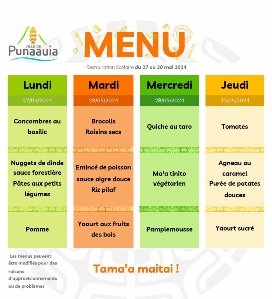Les repas sont Ă©laborĂ©s en suivant les recommandations nationales en matiĂšre d’équilibre alimentaire des enfants. Les menus Ă  4 composantes (entrĂ©e + plat protidique + accompagnement + dessert) sont dĂ©finis en suivant le plan alimentaire de la ville de Punaauia et validĂ©s par une diĂ©tĂ©ticienne de la Direction de la santĂ©.