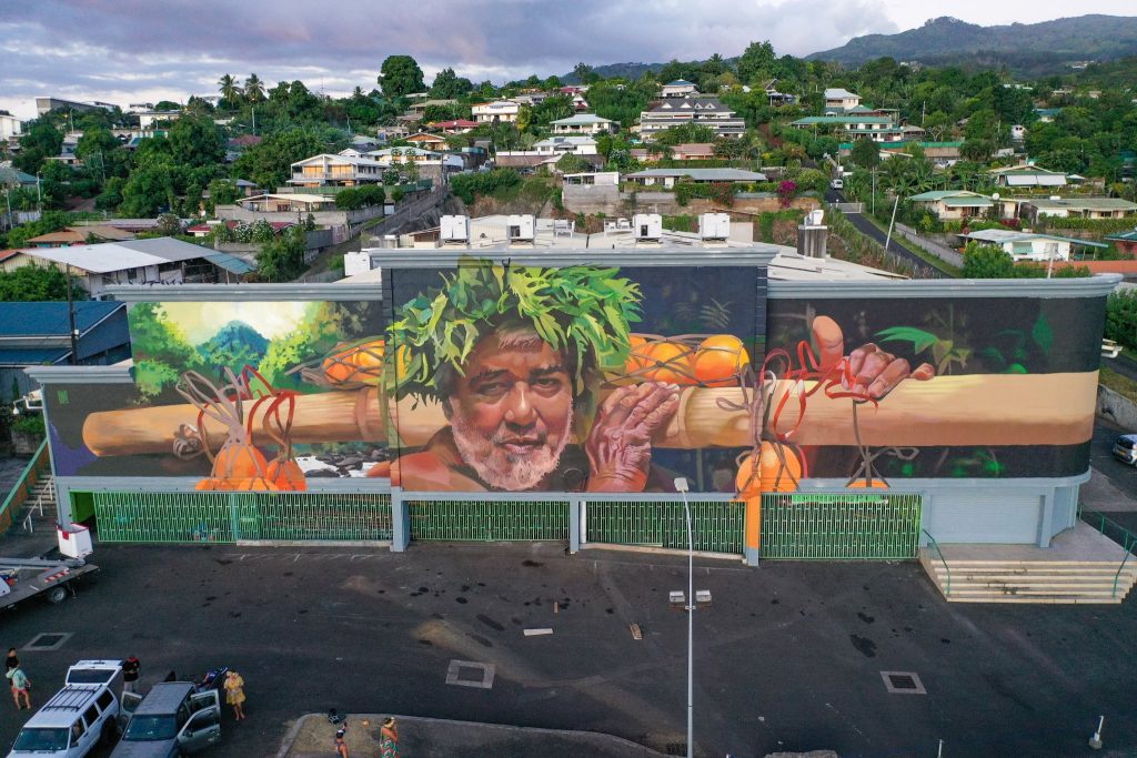Elle a été réalisée par l’artiste allemand, Case MacLaim, connu pour ses œuvres murales au style photo-réaliste, en partenariat avec des artistes locaux, Rival, Tearii Flohr et Ravage, originaire de Punaauia.