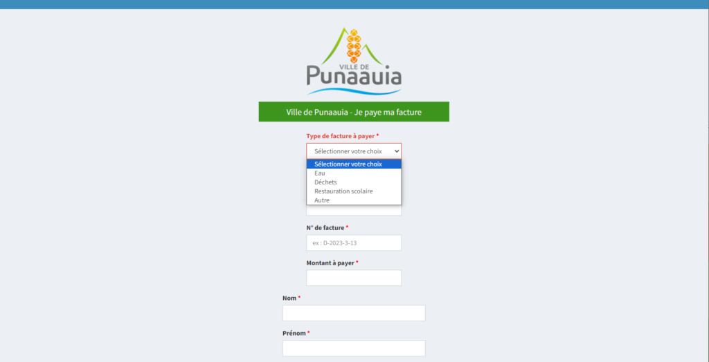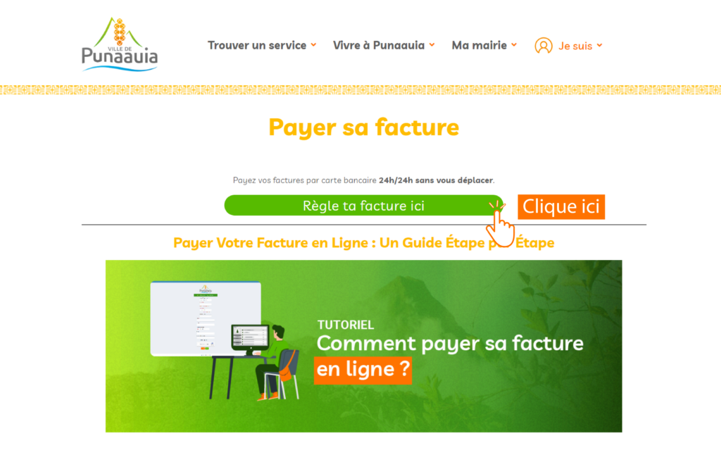 Sur la page d’accueil du site, recherchez le bouton clairement identifiĂ©e comme « RĂšgle ta facture ici ». Cliquez dessus pour accĂ©der Ă  la section dĂ©diĂ©e aux paiements en ligne.