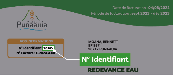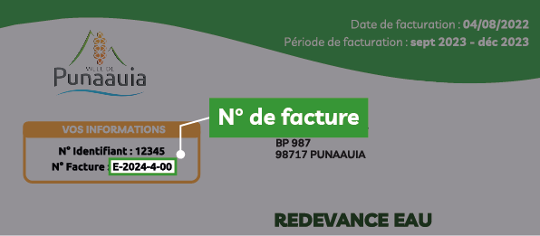 Indiquez ensuite le « NumĂ©ro de Facture ». Ce numĂ©ro est gĂ©nĂ©ralement situĂ© Ă  la suite de votre identifiant. Consultez Ă  nouveau l’illustration pour repĂ©rer cette information. La prĂ©cision de ces deux champs est cruciale pour assurer que votre paiement soit correctement appliquĂ© Ă  votre compte.