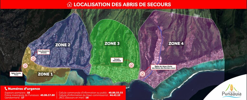 Lorsque des phĂ©nomĂšnes mĂ©tĂ©orologiques graves sont annoncĂ©, la ville de Punaauia met en place des abris d’urgence, avec le soutien des confessions religieuses.